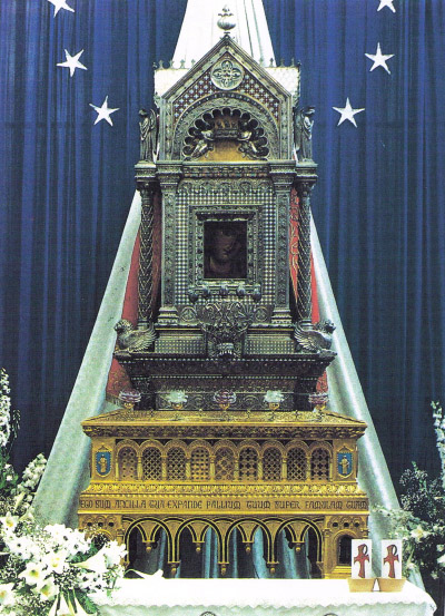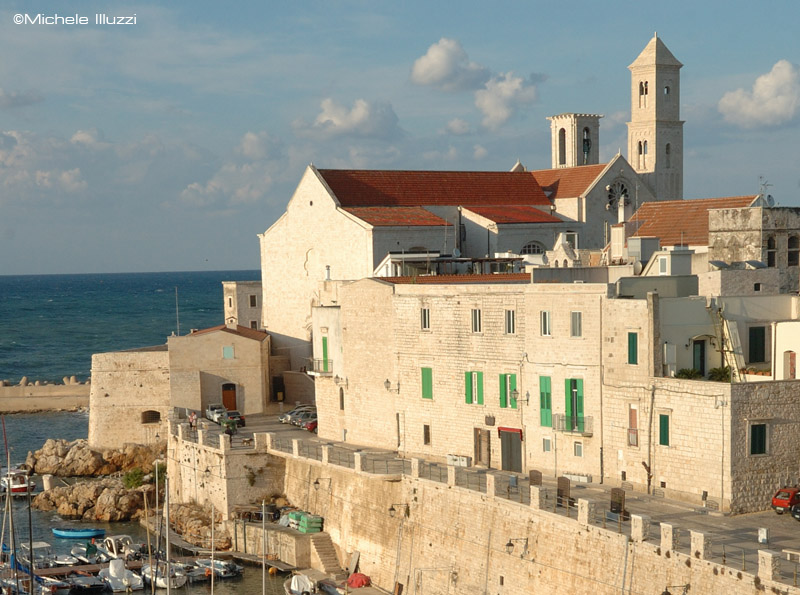 La Madonna con Bambino è un legno dipinto di epoca bizantina; la teca è del secolo XIX di scuola romana e pugliese. Ella protegge dai pericoli del mare, com’è testimoniato per grazia ricevuta alcuni ex voto conservati in Cattedrale ed il dono di due dei tre manti in di seta ricamata che ricoprono il retro della teca. La teca fu eseguita nel 1897 e realizzata con argento e oro provenienti dalla precedente teca, su progetto dell’architetto romano Ettore Bernich, che si era ispirato allo stile bizantino pugliese in sintonia con il dipinto. Durante le fasi di lavorazione lo scultore leccese Eugenio Maccagnani realizzò in cera i modelli per le sculture degli Angeli e del mascherone reggi lampade. Il professor Costantino Calvi cesellò ed ingemmò con pietre preziose antiche il diadema della Madonna. La base, invece, fu costruita con legno dorato dallo scultore Alfredo Pagliari, professore di intaglio presso l’Istituto per Orfani di Giovinazzo, che riportò l’insegna del municipio e, tipo stemma, gli utensili da lavoro delle classi popolari della città. Dei manti in dotazione uno è stato dismesso, quello in seta rossa ricamato in oro copre abitualmente la teca; mentre l’altro in seta azzurra la copre in occasione della processione. Quest’ultimo raffigura una barca a vela incorniciata da una bordura di gigli ricamati in oro, opera della ricamatrice Ninetta Maldari, coadiuvata da Angela Carrieri. E’ ritenuto un capolavoro dell’arte del ricamo in oro.